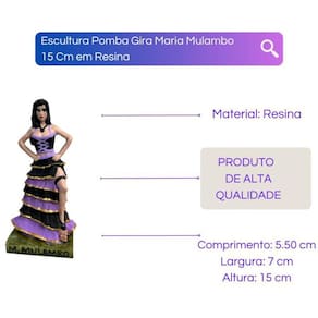 Escultura Pomba Gira Maria Mulambo 15 Cm em Resina Entidade representada por uma mulher sensual, independente e dominadora.Esta escultura em resina trará boas energias, bons fluídos e harmonia para sua casa. É ideal para colocar em seu altar ou completar a decoração de seu ambiente. Esculturas são itens especiais e decorativos, é um recurso que dá um toque a mais em qualquer ambiente, tem um valor espiritual e sentimental. Você pode enfeitar com um estilo próprio com muito bom gosto o seu altar ou ambiente.Aplicação:Decora sala, estantes, home office, altares, aparadores, mesa de canto ou escritório. É também uma ótima opção para presentear, tem um excelente acabamento e pintura feita a mão, permite mais beleza e estilo para sua casa ou escritório.Dimensões da peça aproximadas: C x L x A 5,50 cm x 7 cm x 15 cmPeso aproximado da peça: 271 gMaterial: 100% Resina de alta qualidade - lavávelTire todas as suas Dúvidas antes de concluir a compra. Iremos responder o mais breve possível.Embalagem de Envio:Caixa de papelão ondulado, plástico bolha, conforme necessidade do produto.Consulte nossos preços e condições para vendas.Ideal para o seu altar. Ótima resistência e durabilidade.Respostas das dúvidas mais frequentes na ordem:R1: Já realizamos milhares de entregas em todo o Brasil, somos especialistas no que fazemos.R2: Assim que seu pedido for despachado, esta plataforma envia para você o código de rastreamento.R3: Enviamos o produto 100% inspecionado e conferido em nosso checkout e são embalados em embalagem de papelão e plástico bolha.R5: Iremos despachar o seu produto o mais rápido possível, assim que for confirmado pela plataforma, enviamos em até 24h.R6: Nós queremos a sua satisfação, qualquer problema iremos te auxiliar em nossos canais de comunicações. Marca: Lua Mística - 100% Original - Loja Oficial