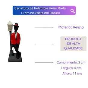 A Escultura Zé Pelintra E Verm Preto 11 Cm No Poste Em Resina é uma peça que pertence à falange de entidades de luz, conhecida por sua elevada sabedoria e poder de proteção. Essa escultura em resina é perfeita para trazer boas energias, fluídos positivos e harmonia para a sua casa.