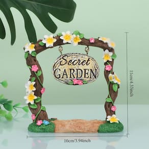 Material: Resina Tamanho: 11 × 10 × 4 cm Peso: 110 g ['• Design encantador de jardim secreto: com uma placa em estilo giratório com texto “Jardim Secreto” e trepadeiras florais, este ornamento cria um efeito de entrada extravagante em paisagens em miniatura ou exibições ao ar livre. ', '• Detalhe de resina artesanal: feita de resina durável, a escultura inclui flores vivas, folhas e texturas de madeira rústica, perfeitas para realçar jardins de fadas, cenas de bonsai ou pátios. ', '• Toque decorativo versátil: ideal para terrários, vasos de plantas, tanques de peixes ou cantos de quintais, ele adiciona um toque de fantasia e narrativa a qualquer arranjo de jardim. ', '• Compacto e leve: fácil de colocar em prateleiras, canteiros de jardim ou expositores de mesa, o boneco se encaixa perfeitamente em configurações de decoração interna e externa. ', '• Melhora a atmosfera do jardim: perfeito para criar cenas temáticas, esse ornamento adiciona personalidade e charme a pátios, varandas, caminhos ou projetos de jardins em miniatura.']