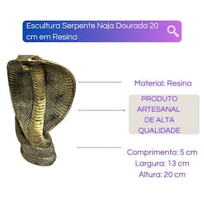 Escultura Serpente Naja 20 cm em Resina - Escolha a Cor Cor: Serpente Naja Dourada Escultura Serpente Naja 20 cm em Resina - Escolha a Corx000D x000d A Escultura Serpente Naja 20 cm em Resina em Resina da Bialluz representa a renovação e eternidade. Nossa Escultura Serpente Naja trará muita sabedoria e luz em sua vida. Emanará muitas energias positivas em seu ambiente e afastará todas incertezas. Confeccionada em Resina nossa escultura tem alta durabilidade e detalhes muito bem feitos que compõem a belíssima qualidade dessa peça.x000d x000d Escolha uma das cores disponíveis na opção COR do próprio anúncio.x000d x000d Enviamos a sua escultura em até 24 horas após a confirmação de pagamentox000D x000d Especificações técnicas:x000D Altura: 20 cmx000D Largura: 5 cmx000D Comprimento: 13 cmx000D Peso: 487 gramasx000D Material: Resinax000D x000d Por ser uma peça feita artesanalmente e pintada à mão podem ocorrer pequenas variações nas cores ou tamanhos.x000d x000d Caso tenha alguma dúvida nos mande mensagem que respondemos rapidinho para te ajudar da melhor forma possívelx000D x000d Marca: Bialluz Marca: Bialluz