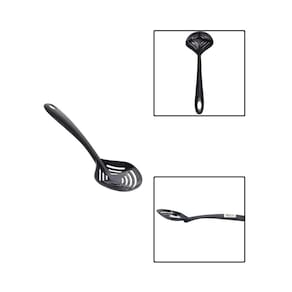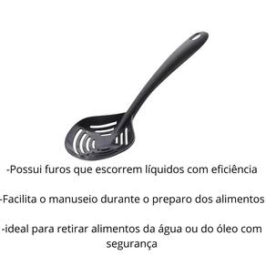 A Escumadeira de Plástico Preta é o utensílio ideal para quem busca praticidade e segurança na hora de cozinhar. Fabricada em plástico resistente e durável, permite escorrer líquidos e retirar alimentos quentes sem riscar suas panelas antiaderentes. Seu design ergonômico e leve proporciona conforto no manuseio, enquanto o acabamento preto traz um toque moderno à sua cozinha. Perfeita para frituras, massas, legumes e muito mais, é indispensável no dia a dia de quem gosta de praticidade e eficiência no preparo das refeições. Especificações: - Marca: Plasutil; - Modelo: 006511; - Dimensões: 30 x 10 x 6,5 cm; - Cor: Preto; - Material: Plástico; - Aplicação: Retirar alimentos da água ou do óleo quente, como massas, frituras e legumes cozidos; - Recomendações: Não expor a fontes de calor intensas forno, chama de fogão ou fritadeiras abertas ; - : 3 meses 90 dias . Conteúdo da embalagem: -01 Escumadeira de Plastico Preta. Marca: Não Informado