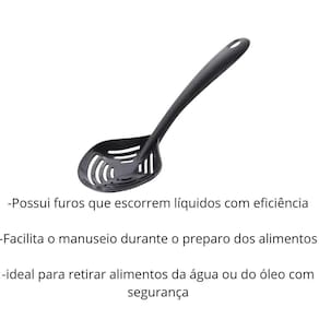 A Escumadeira de Plástico Preta é o utensílio ideal para quem busca praticidade e segurança na hora de cozinhar. Fabricada em plástico resistente e durável, permite escorrer líquidos e retirar alimentos quentes sem riscar suas panelas antiaderentes. Seu design ergonômico e leve proporciona conforto no manuseio, enquanto o acabamento preto traz um toque moderno à sua cozinha. Perfeita para frituras, massas, legumes e muito mais, é indispensável no dia a dia de quem gosta de praticidade e eficiência no preparo das refeições. Especificações: - Marca: Plasutil; - Modelo: 006511; - Dimensões: 30 x 10 x 6,5 cm; - Cor: Preto; - Material: Plástico; - Aplicação: Retirar alimentos da água ou do óleo quente, como massas, frituras e legumes cozidos; - Recomendações: Não expor a fontes de calor intensas forno, chama de fogão ou fritadeiras abertas ; - : 3 meses 90 dias . Conteúdo da embalagem: -01 Escumadeira de Plastico Preta. Marca: Não Informado Ean: 7896042065113