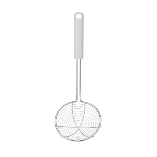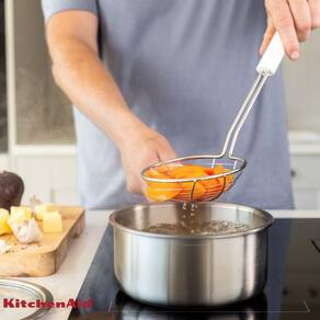 A escumadeira da Coleção Clássica KitchenAid possui a parte principal feita de aço inoxidável extra grande com aberturas, permitindo que o líquido escorra rapidamente.
