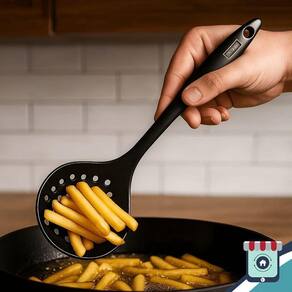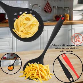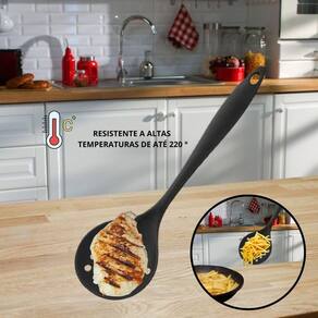 Especificações: Dimensões: Comprimento: 33 cm Material: Silicone Resistência térmica: Até 180C Cor: Preta Peso aproximado: 90g Contem: 01 Escumadeira de Silicone - Preta