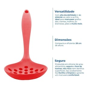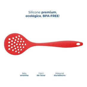Especificações: Dimensões: Comprimento: 33 cm Material: Silicone Resistência térmica: de -50C a 220C Cor: Vermelha Peso aproximado: 90g Contem: 01 Escumadeira de Silicone - Vermelha