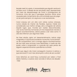 Escuta-me! Um apelo. A necessidade que alguém sente em se fazer ouvir. O desejo de ser escutado, aqui, representado por meio do desassossego de Carol, a protagonista do romance. Uma dor que a persegue durante vários anos causada pelo rompimento de uma amizade que ela julgava ser para sempre. Um equívoco a ser esclarecido. Carol cresceu em um sítio com várias outras crianças, numa cidade do interior da Paraíba. Apenas Cleide era considerada sua melhor amiga, até a chegada de Letícia àquele lugar, que, movida por razões desconhecidas, une-se às meninas, formando um trio inseparável. Devido a alguns acontecimentos, Letícia passa a ser vista como “o cão dos infernos” por algumas mães. Na fase adulta, após um desentendimento, Letícia viaja magoada, e Carol busca acalento na escrita, numa tentativa de compartilhar com a amiga alguns acontecimentos de sua vida: seus amores, suas desilusões, o medo de não poder voltar a engravidar e a grande dor pela perda de alguém especial durante a pandemia no Brasil. Será que algum dia Carol conseguirá mostrar à Letícia o que escreveu? E com isso alcançará o alívio de ser ouvida? Caro leitor(a), se você ficou curioso(a) por saber o final desta história, a autora o(a) convida à leitura do Escuta--me!