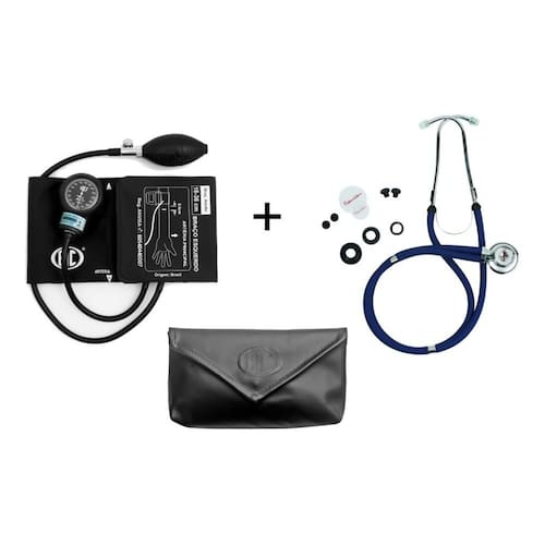 CONTEÚDO DA EMBALAGEM: 01 Aparelho de pressão Adulto Nylon Fecho de Contato New Innova Plus – BIC 01 Estetoscópio Rappaport. 01 membrana adulto 01 membrana Infantil 02 par de olivas macias 02 anéis para ausculta pulmonar adulto e infantil Manual de instruções.