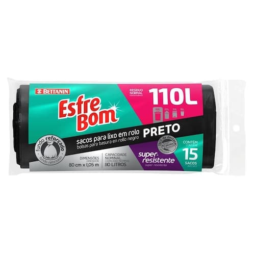 O Saco de Lixo em Rolo Reforçado Preto 110L EsfreBom Bettanin 15 Unidades é super resistente a perfurações. O fundo é reforçado, garantindo mais segurança. Com capacidade de 110L, cada rolo vem com 15 unidades.