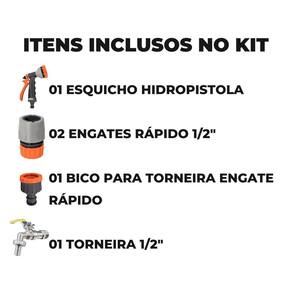 ITENS INCLUSOS 01 Torneira de Metal 1/2 01 Esguicho Hidropistola 6 Jatos Mangueira Jardim Para Engate Rápido 02 Engates Rápido 01 Bico Com Engate Rápido Para Torneiras de 3/4 + Adaptador para Torneiras de 1/2 Marca: Não Informado Ean: 7894141423780