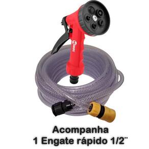Conteúdo da embalagem: 1 Esguicho plástico jardim 5 funções NOVE54 + Mangueira para jardim, trançada, transparente, 20 m, VONDER - Esguicho para jardim. Indicado para uso doméstico, limpeza de calçadas, veículos e jardinagem. Corpo em plástico ABS de alta resistência e jato múltiplo com 5 posições de ajuste ducha central, jato dirigido, cone, leque e misto . Detalhes técnicos do produto Referência 3196012005 - E CDC legal: 90 dias Massa aproximada peso 0.097 kg Tipo do jato Múltiplo Número de posições de ajuste 5 funções Material do esguicho Plástico Tipo de entrada do esguicho Conector macho para engate rápido 1/2 - Mangueira para jardim, trançada, transparente, 20 m, VONDER Conteúdo da Embalagem: 1 Rolo de mangueira para jardim com 20 metros. Acompanha: 1 conector 3/4, 1 adaptador 3/4 para 1/2 e 1 esguicho plástico. Pronta para uso, acompanha a conexão da torneira e esguicho plástico reto. Indicada para condução de água fria na limpeza e irrigação em jardim. legal: 90 dias + contratual: 3 meses DETALHES TÉCNICOS Material da mangueira:PVC Diâmetro interno:7/16 - 11,1 mm Espessura da parede:1,8 mm Pressão máxima de trabalho:140 lbf/pol Cor da mangueira:Transparente Massa aproximada peso :1,548 kg Marca: Não Informado