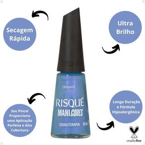 O esmalte azul Risqué ManiCores Esmalterapia é cintilante, de secagem rápida e com ultra brilho. Seu pincel proporciona uma aplicação perfeita e alta cobertura. Além disso, possui longa duração e fórmula hipoalergênica, sendo livre de componentes que costumam causar alergias. Todos os produtos Risqué são aprovados pelo programa Leaping Bunny da Cruelty Free International, padrão ouro globalmente reconhecido para produtos livres de crueldade animal