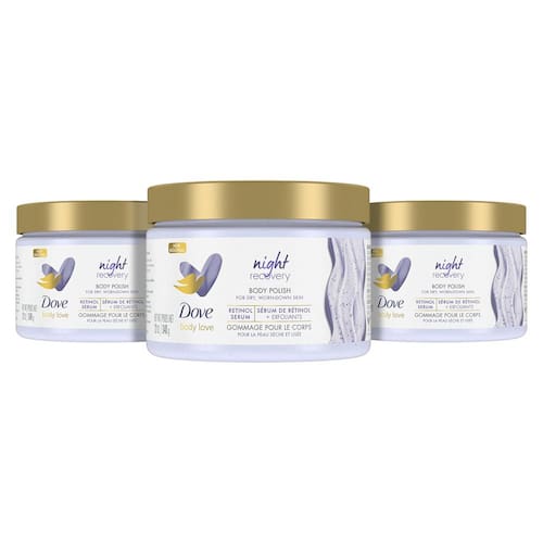 Dove Body Love Body Polish Night Recovery de 3 unidades para pele seca e desgastada, esfoliante corporal com retinol e óleos botânicos para pele sedosa e macia de 12 onças