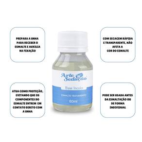 Contém: 01 - Esmalte Tratamento Base Incolor, 60ml, Arte Sedução A Base Incolor da Arte Sedução é um esmalte de tratamento indicado para proteger as unhas. Ela prepara a unha para receber o esmalte e auxilia na fixação, servindo como proteção ao evitar que os componentes do esmalte entrem em contato direto com as unhas. Com aspecto transparente e secagem rápida, garante uma esmaltação perfeita. Na embalagem de 60ml, rende muito mais, sendo ideal para uso em salões de manicure ou mesmo para quem costuma fazer as unhas em casa com frequência. Características Principais: - 60ml; - Protege as unhas evitando contato direto com os pigmentos do esmalte; - Secagem rápida; - Mais brilho; - Acabamento uniforme das unhas; - Pode ser Utilizado antes da esmaltação ou de forma individual; - Excelente Custo-Benefício. Marca: Não Informado