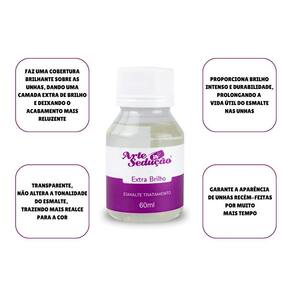 O Esmalte de Tratamento Extra Brilho da Arte Sedução faz uma cobertura brilhante sobre as unhas, dando uma camada extra de brilho e deixando o acabamento mais reluzente. Transparente, ele não altera a tonalidade do esmalte, trazendo mais realce para a cor. Com sua fórmula que proporciona um brilho intenso e excelente durabilidade, prolongando a vida útil do esmalte nas unhas, ele garante a aparência de unhas recém-feitas por muito mais tempo Na embalagem de 60ml, rende muito mais, sendo ideal para uso em salões de manicure ou mesmo para quem costuma fazer as unhas em casa com frequência.
