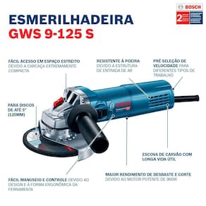 Esmerilhadeira 900w bosch gws 9-125 s com veloc variável 110v Voltagem: 110v Esmerilhadeira angulat de 5 900w bosch gws 9125 s com velocidade variável + acessórios A esmerilhadeira angular bosch gws 9-125 s possui 900 watts de potência, e é uma solução para realização de cortes eDesbastes em materiais metálicos, como ferro e aço. Também pode ser utilizada para corte em alvenaria e concreto. note que para cada tipo de aplicação existe um acessório correto - discos abrasivos ou discos diamantados .Esta máquina conta com capa de proteção de 5 / 125 milímetros com sistema de fixação por meio de parafuso,Que garante que a capa não se desloque em caso de rompimento do disco, dando mais segurança ao operador da ferramenta.Conta também com empunhadeira auxiliar e corpo mais delgado em forma redonda. Essas características geram praticidade eTrabalhos menos cansativos ao usuário. Além disso, esta esmerilhadeira disponibiliza seletor de velocidades 6 níveis - 2800 a 11000 rpm Para trabalhos em diferentes aplicações e tipos de acessórios, tais como lixamentos ou aplicações em aço inoxidável .Por ser compacta facilita aplicações em locais de menor tamanho e de difícil acesso. A esmerilhadeira gws 9-125 s é indicada para uso industrial.Trabalho intenso. Esse kit traz: 1 chave de aperto 1 porca de apoio 1 porca de aperto 1 capa protetora 1 punho auxiliar.Motor com 900 watts de potência. Capa de proteção de 5 / 125 mm - com sistema de fixação por parafuso robustez .Carcaça de engrenagens em alumínio, extremamente robusta.Uso industrial com 2 anos de garantia. Características:Potência nominal absorvida: 900 wNº de rotações em vazio: 2.800 - 11.000 r.P.M. do disco: 125 mmRosca do eixo de esmerilhamento: m14Peso: 1,9 kgInterruptor: interruptor bloqueávelPotência útil: 450 wDimensões da ferramenta largura : 73 mmDimensões da ferramenta comprimento : 280 mmDimensões da ferramenta altura : 100 mmPossui garanti de 2 anos Itens inclusos:-01 chave de aperto;-01 porca de apoio;-01 porca de aperto;-01 capa protetora;-01 punho auxiliar; -01 óculos de proteção; -05 discos de corte; -01 maleta.