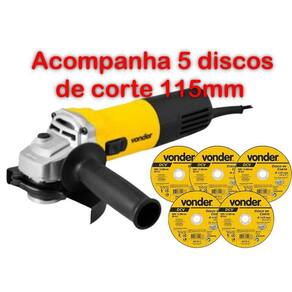 Conteúdo da embalagem: 1 esmerilhadeira angular 5 eav 905v vonder 900w 220v com velocidade variável + 5 discos de corte 115,0 mm x 1,0 mm x 22,23 mm, dcv, vonder 1 esmerilhadeira angular. Acompanha: 1 capa de proteção com trava de ajuste rápido, 1 punho auxiliar e 1 chave 2 pinos .Possui velocidade variável em 6 níveis e punho auxiliar com duas posições de fixação, que atuam como apoio durante o manuseio da ferramenta, adaptando-se a diferentes situações e locais de uso, muitas vezes de difícil acesso. Conta ainda com botão de trava do eixo, com trava de segurança e empunhadura ergonômica, que conferem maior conforto no manuseio, além de dupla isolação, garantindo maior segurança ao operador. Indicada para cortar, lixar, polir e esmerilhar superfícies metálicas. O equipamento deve ser utilizado somente com acessórios compatíveis. legal: 90 dias + contratual: 9 meses para locadoras, única e exclusiva de 90 dias Detalhes técnicos Modelo : eav 905v Potência : 900 w Capacidade da esmerilhadeira disco : 5 - 125 mm Rosca do eixo : m14 Tipo de velocidade : variável Rotação rpm : 2.800/min a 11.000/min. N1: 2.800/min; n2: 4.000/min; n3: 5.400/min; n4: 7.000/min; n5: 8.800/min; n6: 11.000/min Ajuste do cabo da esmerilhadeira : fixo Número de posições de ajuste do punho : 2 posições Segue norma : abnt nbr iec 60745-1 e abnt nbr iec 60745-2-3 Tensão v : 220 v Frequência : 50 hz/60 hz Aceleração transmitida nas mãos - braços do operador - ah : 4,32 m/s Incerteza da aceleração transmitida nas mãos - braços do operador - k : 1,5 m/s Massa aproximada peso : 2,083 kg - disco de corte. Proporciona cortes rápidos e menor geração de calor e rebarbas.Indicado para cortar aços e suas ligas, inclusive aço inox. Ideal para operações de corte que necessitam excelente acabamento corte fino . Não utilizar em serra mármore. legal: 90 dias Modelo: dcv Diâmetro do disco de corte: 115 mm Espessura: 1,0 mm +/-3/64 Tipo de disco: tipo 41 Diâmetro do furo: 22,23 mm 7/8 Grão: g 60 Número de telas do disco: 2 Rotação máxima do disco rpm : 13.300/min Segue norma s : abnt nbr 15230 e abnt nbr 16245