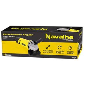 Esmerilhadeira Angular 4 1/2 650W 11000RPM Titanium A Esmerilhadeira Angular 4 1/2 650W modelo 7774 é uma ferramenta compacta e potente, ideal para cortes, desbastes e acabamentos em diversos materiais, como metal, concreto e alvenaria. Com um motor de alta performance e design ergonômico, ela oferece precisão e conforto para trabalhos profissionais e domésticos. Especificações Técnicas Marca: Titanium Modelo: 7774 110V / 7775 220V Potência: 650W Tensão: 220V ou 110V Diâmetro do Disco: 4 1/2 115 mm Velocidade Sem Carga: 11.000 RPM Tipo de : Deslizante Peso: Aproximadamente 2,0 kg Rosca do Eixo: M14 Nível de Ruído: Aproximadamente 90 dB Itens Inclusos Disco de corte/desbaste Chave de aperto Capa de proteção ajustável Empunhadura lateral Manual do usuário Peso: Aproximadamente 2,0 kg Rosca do Eixo: M14 Nível de Ruído: Aproximadamente 90 dB Itens Inclusos Disco de corte/desbaste Chave de aperto Capa de proteção ajustável Empunhadura lateral Manual do usuário Marca: Não Informado