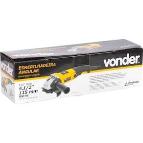 Esmerilhadeira Angular 4.1/2" 860 Watts 110V Eav860 Vonder Aplicações e dicas de uso Possui punho auxiliar com duas posições de fixação que atua como apoio durante o manuseio da ferramenta, adaptando-se a diferentes situações e locais de uso, muitas vezes de difícil acesso. Conta com empunhadura ergonômica que confere maior conforto, botão de trava do eixo e dupla isolação, garantindo maior segurança ao operador. Indicada para corte, desbaste e acabamento em superfícies metálicas Indicada para corte, desbaste e acabamento em superfícies metálicas Características Técnicas