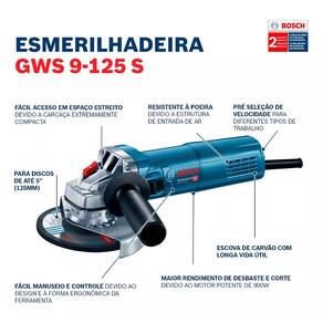 A esmerilhadeira angular Bosch GWS 9-125 S, possui 900 Watts de potência, 127 V e é a solução ideal para realização de cortes e desbastes em materiais metálicos, como ferro e aço, e também pode ser utilizada para corte em alvenaria e concreto. A esmerilhadeira angular Bosch GWS 9-125 S conta com capa de proteção de 125mm, com sistema de fixação por meio de parafuso, que garante que a capa não se desloque em caso de rompimento do disco, dando mais segurança ao operador da ferramenta. Conta também com empunhadura auxiliar traz mais conforto durante o uso. Seu formato ergonômico e o peso reduzido de 1,7 kg permite trabalhos mais longos e facilita aplicações em locais menores e de difícil acesso. A esmerilhadeira angular Bosch GWS 9-125 S disponibiliza seletor de velocidades de 6 níveis (2800 a 11000 rpm) para trabalhos em diferentes aplicações e tipos de acessórios, como lixamentos ou aplicações em aço inoxidável.