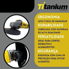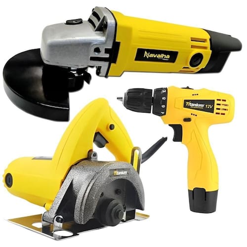 Kit Esmerilhadeira Angular + Parafusadeira 12v Furadeira +Serra + Esmerilhadeira Navalha Angular 600W 4.1/2 9.500RPM Titanium + Parafusadeira Furadeira 12V 1,2Ah 6238 Titanium + Serra Mármore 4.3/8 1100w Titanium Esmerilhadeira Navalha Angular 600W 4.1/2 9.500RPM Titanium Caracteristicas: A Esmerilhadeira Navalha Angular 600W Titanium é uma ferramenta robusta e versátil, ideal para cortes, desbastes e acabamentos em diferentes materiais, como metais, concreto e alvenaria. Com seu motor potente de 600W, ela garante eficiência em trabalhos de serralheria, construção civil e até projetos DIY faça você mesmo . Benefícios: - Ergonomia: leve e fácil de manusear, a esmerilhadeira conta com um punho auxiliar que oferece maior controle e conforto durante o uso. Versatilidade: ideal para cortes, desbastes e acabamentos em diversos materiais. - Durabilidade: fabricada com materiais de alta qualidade, projetada para durar mesmo em condições de uso intensivo. Segurança: equipada com capa de proteção para evitar acidentes durante o manuseio. - Este produto é perfeito para profissionais que trabalham com construção civil, metalurgia, ou para quem realiza serviços domésticos com frequência. A Esmerilhadeira Navalha Angular 600W - Titanium oferece precisão, potência e segurança, sendo uma excelente escolha para suas atividades Recomendações de Uso: - Segurança: Utilize sempre os Equipamentos de Proteção Individual EPIs como óculos, protetor auricular e luvas ao operar a esmerilhadeira. - Manutenção: Limpe regularmente e verifique o estado do disco de corte para manter o bom desempenho da ferramenta. - Armazenamento: Guarde a esmerilhadeira em local seco e arejado, protegida de umidade para prolongar sua durabilidade. Marca: Titanium Modelo: 08254 110V / 08255 220V Capacidade do disco: 4.1/2 115mm Potência: 600W Rotação: 9.500 RPM + Parafusadeira Furadeira 12V 1,2Ah 6238 Titanium Caracteristicas: Ferramenta de aperto, afrouxamento e furação simples. A Parafusadeira elétrica a bateria Titanium possui mandril de 3/8 pol. 10mm com aperto rápido e ajuste de torque/perfuração, regulagens com posição para perfuração e botão de sentido horário e anti-horário de rotação. Conta também com de acionamento, seletor de reversão da rotação e luz LED para melhor visibilidade. - Parafusadeira elétrica a bateria - Velocidade - Precisão - Compacta Especificações: - Marca: TITANIUM - Referência: 6238 - Voltagem: Bivolt - Bateria: 12V, luz de led, 1,2 Ah - Tipo de Bateria: bateria de ions de litio - Mandril: 0.8-10 mm - Tipo de Mandril: aperto rápido - Tipo de velocidade: Variável - Tamanho: 3/8 - Torque: 20 Nm - Rotação: 2 velocidades: 0-200rpm e 0-1000rpm - Sistema de Reversão: Sim - Dimensões aproximadas CxLxA : 19 x 4 x 19 cm - Peso aproximado: 1 kg + Serra Mármore 4.3/8 1100w Titanium 110v Serra mármore 4.3/8 1100 watts da Titanium é uma ferramenta elétrica apropriada para uso em construções, pois corta mármore, granito, concreto, alvenaria, telha, tijolo, ardósia, pedras em geral. Madeira e muito mais utilizando os discos de cortes corretos. Possui motor potente, proporcionando ótimo acabamento ao corte. Conta com trava de gatilho, que facilita os trabalhos mais longos. Sua regulagem de profundidade permite ajustes de corte com mais precisão e proporcionando melhor acabamento. Especificações Marca: Titanium Modelo: 07664 Voltagem: 110v/220v Diâmetro do disco: 110mm Diâmetro do eixo: 20mm Diâmetro do disco mm : 110 Diâmetro do disco polegada 4.3/8 Potência: 1100W Rotação Máxima: 11000 Largura 23cm: Altura: 18cm Comprimento: 20cm Peso: 2.50 Kg Itens Inclusos 1 Esmerilhadeira 1 serra mármore 1 chave inglesa 1 capa de metal 115mm 1 punho auxiliar 1 chave de fixação 1 Disco. 1 Parafusadeira 1 Bateria 12V 1 Carregador Bivolt