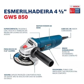 Esmerilhadeira Angular 4.1/2" 850W GWS 850 220V BoschPara quem precisa de uma ferramenta eficiente e segura para realizar serviços de corte e abastes em metais, avelnarias e concreto, a Esmerilhadeira Angular 4.1/2" 850W GWS 850 220V Bosch é a solução ideal!Com um design leve e compacto, ela possibilita maior comodidade em seu uso. A esmerilhadeira é indicada para trabalhos em pequenas áreas e uso frequente.Características da Esmerilhadeira Angular 4.1/2" 850W GWS 850 220V BoschEsta esmerilhadeira do modelo GWS 850 é da marca Bosch. Utiliza disco angular de 115 mm ou 4.1/2”. Possui eixo M14 com trava. Funciona por eletricidade, com 220V de tensão elétrica. Tem velocidade de 11000 RPM, 850W de potência e não possui controle de velocidade.A ferramenta acompanha uma incrível maleta que contém: 1 Punho Auxiliar; 1 Chave de Pinos; 1 Capa de Proteção; 1 Flange e 1 Porca de Aperto. A maleta mede 83 mm de altura, 243 mm de largura, 290 mm de profundidade e pesa 2,75 kg.Vantagens da Esmerilhadeira Angular 4.1/2" 850W GWS 850 220V BoschA Esmerilhadeira Angular 4.1/2" 850 W GWS 850 220V Bosch é uma ferramenta leve e compacta, que pode ser levada para qualquer lugar e com um corpo ergonômico que garante um manuseio confortável;A marca Bosch é garantia de um produto de qualidade, que proporciona o melhor acabamento para sua peça a um preço acessível. Além disso, ela possui excelente rendimento, o que diminui o tempo do seu serviço.Ela conta com uma potência adequada para aplicações profissionais de pequeno porte somado a uma durabilidade garantida pelo interruptor de acionamento selado contra a entrada de pó, o que aumenta a vida útil.Junto de todas essas vantagens, a Esmerilhadeira Angular 4.1/2" 850W GWS 850 220V Bosch é sinônimo de segurança graças a capa de proteção de 4.1/2" (115mm) com sistema de fixação por meio de parafuso, que faz com que a capa não se desloque em caso de rompimento do disco.Informações ExtrasA esmerilhadeira Bosch possui 1 ano de garantia pelo fabricante!Atenção: para um manuseio seguro da ferramenta, é indicado o uso de equipamento de proteção individual.