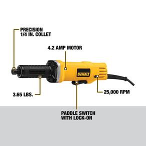 - O motor de 4,2 A e 25.000 rpm fornece alta potência e velocidade para todas as aplicações de moagem de 1-1/2"