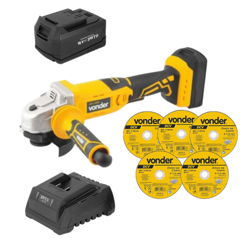 Conteúdo da Embalagem: 1 Esmerilhadeira 4.1/2 IEV 1808 Vonder + 1 Carregador de bateria DWT + 1 Bateria 18V 4Ah DWT + 5 Discos de corte 115,0 mm x 1,0 mm x 22,23 mm, DCV, VONDER