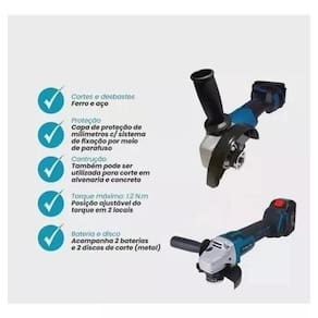 Esmerilhadeira Lixadeira 125 mm Com Bateria Recarregável 26v Esmerilhadeira Lixadeira 125 mm Com Bateria Recarregável 26v LE-1817 Descrição; BIVOLTLixadeira Esmerilhadeira Angular 26V é uma solução para realização de cortes e desbastes em materiais metálicos, como ferro e aço. Esta máquina conta com capa de proteção de milímetros com sistema de fixação por meio de parafuso, que garante que a capa não se desloque em caso de rompimento do disco, dando mais segurança ao operador da ferramenta. Também pode ser utilizada para corte em alvenaria e concreto. Conta também com empunhadeira auxiliar e corpo mais delgado em forma redonda. Essas características geram praticidade e trabalhos menos cansativos ao usuário. Informações Técnicas: Corrente sem carga: 4A Ruído sem carga: 76dB Torque máximo: 1.2 N.M Posição ajustável do torque em 2 locais Velocidade nominal: 8000r/min Diâmetro máximo: 100mm Profundidade de corte: 30mm Itens Inclusos: 1x Lixadeira Esmerilhadeira Angular 26V 125MM 1x Carregador 1x Chave de Esmerilhadeira 2x Discos de corte metal 2x Baterias 26V 4.0AH Marca: It-Blue Le26V Le-1817