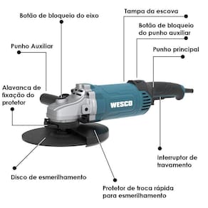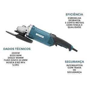 Esmerilhadeira angular com 180 mm e 2.000 w da wesco, modelo ws4721 + 3 discos vonder, luvas e óculos Este é o lançamento da wesco, a superesmerilhadeira ws4721 com 2000w e pronta para o trabalho de alta performance. Ela é robusta e possui uma carcaça resistente, que possibilita a sua ação em locais que exigem força e qualidade. Diferenciais da ws4721 Possui caixa de engrenagens em alumínio; Conta com empunhadura principal giratória para melhor posicionamento de uso; Possui capa de proteção com ajuste sem chaves; Vem com empunhadura auxiliar com 3 posições; Conta com o sistema de trava de eixo para a troca do disco; Para a sua segurança, a ws4721 é equipada com com trava de segurança e liga/desliga lateral. Dados técnicos: Tensão nominal: 50/60hz; Potência nominal: 2000 w; Velocidade nominal: 8000 /min; Tamanho do risco: 180mm; Furo dos discos: 22.2mm; Rosca do eixo: m14; Duplo isolamento: sim; Peso: 5.5kg. Itens que acompanham a máquina: -01 capa de proteção com ajuste rápido; -01 empunhadura auxiliar; -01 chave para troca do disco; -01 chave allen; -03 discos vonder; -01 par de luvas; -01 óculos de segurança. Marca: Não Informado Ean: 7909463124267