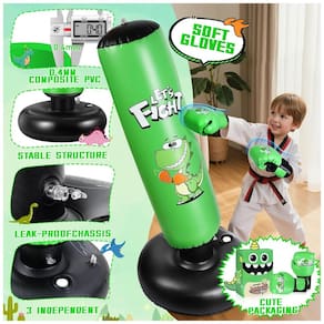 O conjunto acompanha par de luvas infantis em material sintético leve, dimensionadas para mãos pequenas, permitindo que a criança pratique golpes com mais conforto. A estrutura inflável é montada por enchimento de ar na parte superior e base com lastro líquido, possibilitando retorno após os impactos e facilitando o esvaziamento para armazenamento quando necessário.