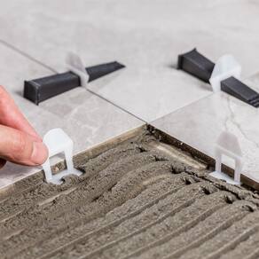 2. Assente o próximo revestimento e então encaixe as Cunhas na abertura do Espaçador Nivelador. (O uso de Alicate é opcional).