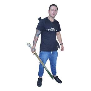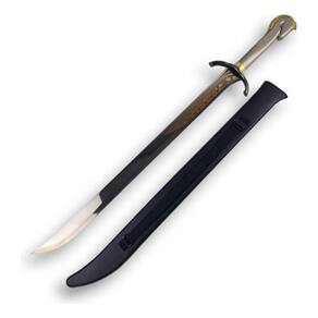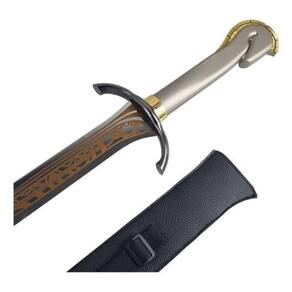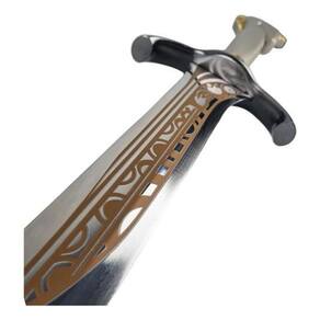Esta espada é uma réplica impecável que traz detalhes minuciosos e um design inspirador. Com seu cabo decorado com uma cabeça de cavalo em metal e crina dourada, juntamente com uma guarda niquelada, a espada transmite a nobreza e o espírito heróico de Númenor.
