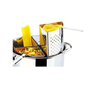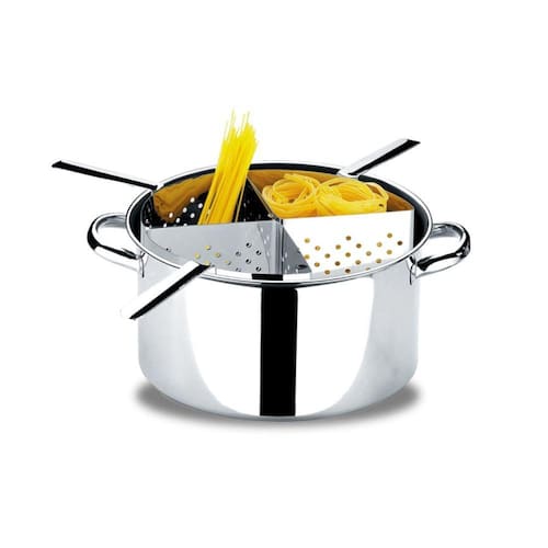Transforme a sua cozinha em uma cantina e faça um verdadeiro festival de massas. A espagueteira com quatro divisões da linha Suprema conta com uma panela de aço inox e quatro cestos escorredores, que permitem preparar e escorrer diferentes tipos de massa ao mesmo tempo. Fabricadas em aço inox, as peças são resistentes e não apresentam porosidades, por isso não alteram o sabor e o aroma dos alimentos e são fáceis de limpar. O modelo inclui 01 espagueteira (ø 31cmx16,5cm) com capacidade para 10L e 04 cestos de aço inox com encaixe para adaptacão às bordas da espagueteira.