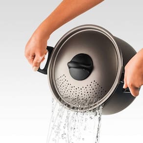 Descrição A praticidade e segurança de preparar o macarrão na caçarola e escorrer diretamente na tampa. A tampa possui uma trava de segurança, é só fechar e escorrer a massa. A Espagueteira Brinox, que tem capacidade para até 5,5L e é de alumínio com interior antiaderente ¿¿¿ que faz com que seja muito mais fácil de limpar e deixa o preparo dos alimentos com menos óleo. Está disponível em 3 cores: prata, turquesa e cereja. Uma panela especialista no que faz. Material Alumínio Linha Especiarias Composição 01 Espagueteira Ø22cm 5,5L Prata Certificação Classificação A (ótima) Registro-001463/2018 OCP-Senai/RS Garantia 90 dias para vícios ou defeitos de fabricação. Instruções de Uso: Não vai a lava louça, não vai a fogão de induçõa, não vai ao micro-ondas, não pode ir ao forno