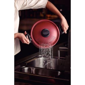 A trava de segurança da tampa permite mantê-la fixa junto a panela, facilitando escorrer os alimentos.