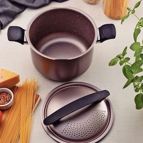 Cozinhe massas com maior facilidade na espagueteira Tramontina Milazzo em alumínio com revestimento interno e externo em antiaderente Starflon Max amêndoa 22 centímetros de diâmetro. Desenvolvida para uso no dia a dia, ela tem corpo de alumínio com revestimento antiaderente Starflon Max e garante um cozimento uniforme e fácil limpeza, evitando que os alimentos grudem. As alças de baquelite antitérmico com acabamento soft-touch oferecem segurança e conforto durante o manuseio. Acompanha tampa de alumínio com furos escorredores, trava de segurança e pegador de nylon, facilitando o escoamento da água. Pode ser usada em fogões a gás, elétrico e vitrocerâmico, oferecendo grande versatilidade. Escolha a espagueteira Tramontina Milazzo e adicione um toque de qualidade à sua cozinha!
