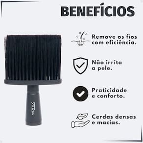 Espanador Black Vertix Belliz Base Reta Cód. 3173 O Espanador Black Vertix Belliz Base Reta Cód. 3173 foi desenvolvido para oferecer praticidade, conforto e eficiência na remoção de cabelos cortados durante o atendimento. Com cerdas macias e densas, ele elimina facilmente os fios do pescoço, rosto e roupas, sem causar irritação à pele. Seu design ergonômico com base reta garante firmeza e estabilidade no manuseio, tornando-o essencial para barbeiros e cabeleireiros que buscam acabamento profissional com estilo e precisão.