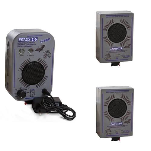 Espanta Rato E Morcego E 2 Unidade Remota Zebu Ermu 1/5 Turbo 10782-10790x2 - Proteja seu espaço de forma eficaz, prática e segura! - Este conjunto combina o espanta rato e morcego ERMU-1/5 Turbo com duas unidades remotas UR-1079, ampliando a cobertura de até 450 m. - Com tecnologia ultrassônica confiável, você mantém sua casa, sítio ou empresa livre de roedores e morcegos sem contato químico. - Invista na tranquilidade e segurança que só a Zebu oferece! CONJUNTO COMPOSTO POR: 1 UN - ESPANTA RATO E MORCEGO ERMU-1/5 -1078 2 UN - UNIDADE REMOTA ESPANTA RATO E MORCEGO UR-1079