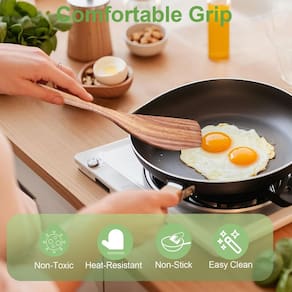 - Não arranha e resistente ao calor: estas espátulas de madeira são suaves nas superfícies de suas panelas antiaderentes e outros utensílios de cozinha, garantindo que não as arranhem ou danifiquem. Nossas colheres de cozinha de madeira não conduzem o calor de forma eficiente. Isso os torna excepcionalmente seguros para manusear mesmo em altas temperaturas, permitindo que você mexa, vire e sirva com confiança sem preocupações com queimaduras ou transferência de calor.