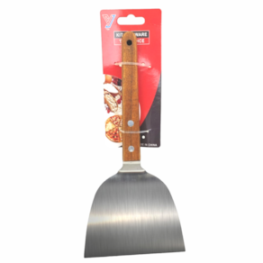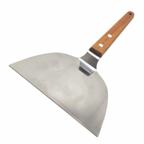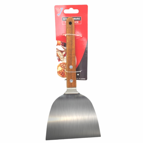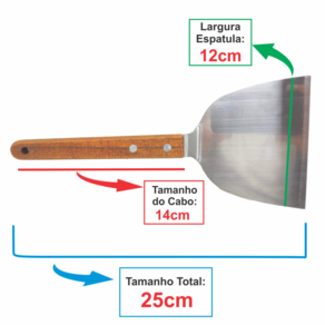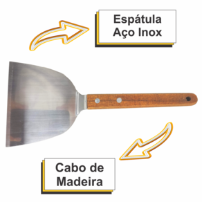 Espátula reta em aço inox, ideal para fazer lanches, massas, assados, hambúrgueres feitos em chapas, auxiliar no corte de pizzas. A espátula é feita em aço inox e o seu cabo em madeira.