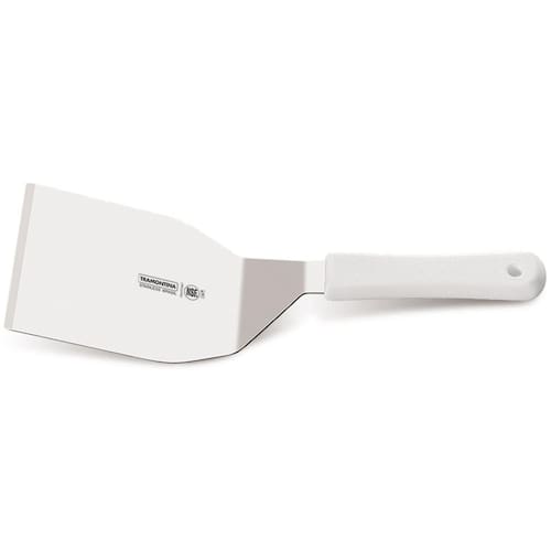 Espátula Hambúrguer Profissional Tramontina 24677187 1. Lâmina fabricada com aço inox de altíssima qualidade, aliada ao eficiente tratamento térmico sub-zero. 2. Cabo de polipropileno com proteção antimicrobiana que inibe o crescimento de bactérias e fungos. 3. Cabo com furo passante para pendurar o produto. 4. Certificada pelo NSF, National Sanitation Foudation, organização reconhecida internacionalmente pelas práticas de consultoria, inspeção e treinamento, voltados à garantia da sanidade de alimentos, água, ar e ambiente. 5. Pode ir à máquina de lavar louças. 6. Permanece bonita por muito mais tempo. Medidas aproximadas do produto - Comprimento: 38 cm - Altura: 13 cm - Largura: 10 cm - Peso: 290 g