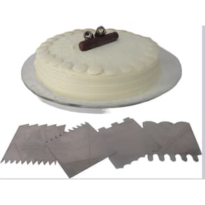 Espátula Decorativa de Bolo em Aço Inox para ConfeitariaEspátulas Decorativas para Bolo são práticas e facilitam trabalho com as decorações de bolos, agilizando o acabamento, decorativo e profissional.Material em Aço Inox , são 4 peças e 8 pode se utilizar 8 desenhos, solte a imaginação e faça lindos trabalhos com as Espátulas Decorativas para Bolo ou marcadores para bolos como também são conhecidos.Dimensões e características :- Material: aço inox- Tamanho : altura 6,5cm X 7cm Comprimento X Largura QuantidadeKit com 4 unidades - 8 desenhosEstamos a disposição para Perguntas