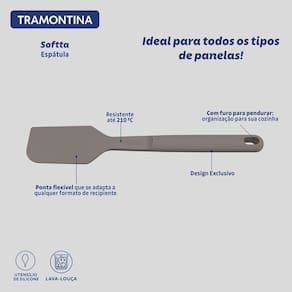 Seu design ergonômico oferece um manuseio confortável e eficiente, enquanto a sua superfície flexível ajuda para mecher ou raspar toda a massa de bolo do seu recipiente. A espátula Tramontina Softa é extremamente fácil de limpar, podendo ser lavada na máquina de lavar louça, e traz um toque de elegância para a sua cozinha