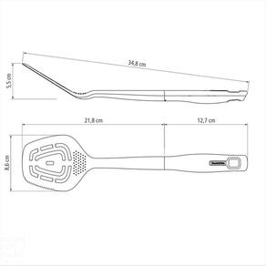 Quem adora cozinhar sabe que utensílios práticos sempre ajudam a obter o melhor resultado. E a Espátula Tramontina Verano com Bojo em Nylon e Cabo de Polipropileno com Mini Ralador Ônix é perfeita para você. Ela possui um mini ralador e serrilha no lado esquerdo para cortes suaves, seu bojo é feito em nylon e possui um moderno cabo ergonômico. Uma peça resistente até 180º C de temperatura e que pode ir à máquina de lavar louças. Preparar e servir suas receitas ficou ainda mais prático e fácil! Orientações Espátula de nylon, que resiste até uma temperatura de 180 °C. Cabo de polipropileno com furo passante possibilitando que seja pendurado na sua cozinha. Utensílio ideal para uso em panelas com revestimentos antiaderentes e cerâmicos, pois não danifica o produto. Pode ir à máquina de lavar louças facilitando seu dia a dia. Características Gerais EAN13 7891112262683 DUN14 17891112262680 NCM 3924.10.00 Peso Líquido 0,0950 kg. Peso Bruto 0,1000 kg. Metragem 0,001951 m³. Dimensões Embalagem (Compr. X Larg. X Alt.) 86x 57x 398 mm. Dimensões Produto (Compr. X Larg. X Alt.) 348x 86x 55 mm. Cor 1 333F48 Hexa Cor 2 707372 Hexa Observações Antes da primeira utilização, lave bem a peça e seque-a. Para maior durabilidade do produto recomenda-se secar bem antes de guardar, mesmo após lavagem em máquina. Para descarte do produto e embalagem siga as orientações de reciclagem vigentes.