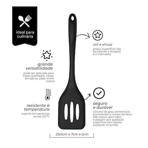 Facilite o preparo das suas receitas com a espátula vazada de cozinha Mimo Style Espátula Vazada De Silicone Preto Resistente, ideal para uso diário. Produzida em silicone, pode ser levada ao fogo e não arranha o teflon, garantindo praticidade e preservação das panelas. A superfície lisa, livre de BPA, facilita a limpeza e não libera substâncias tóxicas na comida. A pega redonda e confortável, aliada ao peso leve de 110 gramas, torna o manuseio mais seguro e reduz a fadiga do pulso. Versátil, combina com diferentes estilos de cozinha e ainda pode compor a decoração pelo seu acabamento em preto.