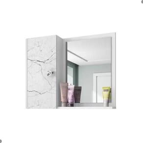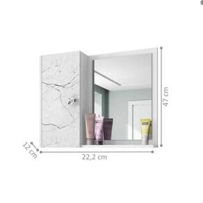 Estrutura em MDP. Possui 1 porta, 1 prateleira, 2 nichos e conta com um espelho fixado e fita de papel decorativo