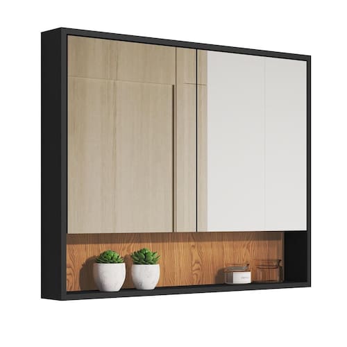 Espelheira Eros Armário Aéreo Para Banheiro - Preto/Madeira Descrição