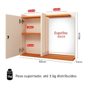 A Espelheira Madri é um item indispensável para quem deseja manter o banheiro organizado e funcional. Com um design moderno e sofisticado, ela pode ser facilmente instalada em qualquer parede e oferece praticidade no dia-a-dia.Ela conta com uma porta que permite armazenamento de itens de higiene pessoal de forma discreta e segura, protegendo-os da umidade e do acúmulo de poeira.A Espelheira também possui um espelho de excelente qualidade, oferecendo uma imagem nítida e clara, facilitando a realização de ações diárias, como: escovar os dentes, fazer a barba, se maquiar, entre outras atividades.A Espelheira Madri deixará seu banheiro elegante como sempre sonhou.Dimensões do produto montado:Altura: 46 cmLargura: 60 cmProfundidade: 10 cmPeso Suportado: Até 3 kg distribuídos.Observações:- Produzida em MDP;- 1 Porta com dobradiças metálicas;- 1 Espelho;- Os objetos que ambientam as fotos não acompanham o produto;- O produto será entregue desmontado;- É de inteira responsabilidade do cliente a montagem do produto e/ou instalação, custos de transporte por escadas e/ou elevadores, guincho ou içamento, assim como possíveis danos provenientes de manuseio inadequado;- Embora o produto acompanhe o manual de montagem, verifique a complexidade antes de decidir montá-lo sozinho, recomendamos que contrate um profissional de sua confiança;- Mantenha as informações de contato e endereço de entrega atualizadas para entrarmos em contato, caso seja necessário;- Fique atento, nossas cores podem sofrer alterações dependendo do seu monitor;- ANTES DE MONTAR O SEU PRODUTO, certifique-se que todas as instruções dispostas no manual, bem como todas as ferragens descritas, estejam presentes dentro da embalagem.- Verifique se há alguma peça danificada, caso haja, prestaremos a devida assistência dentro do prazo da garantia.- As Lojas RPM não se responsabiliza por danos, caso o produto não esteja sendo utilizado da forma correta como instruído no manual de montagem!- Imagens meramente ilustrativas.