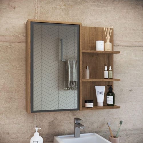 O armário espelheira ES2001 da Faema vai lhe proporcionar muita praticidade, otimização de espaço e ainda mostrar que você tem bom gosto! Possui uma porta com espelho e 2 prateleiras internas ideais para você dispôr seus produtos de beleza e higiene. Contém também duas prateleiras externas. Venha conferir! Acabamento da Porta: Finish Foil Acabamento da Prateleira: Finish Foil Altura do Espelho: 58,2 cm Altura do Espelho 01: cm Altura do Espelho 02: cm Altura do Espelho 03: cm Altura do Espelho 04: cm Altura do Espelho 05: cm Altura do Espelho 06: cm Ambiente Principal: Banheiro Complexidade da Montagem: Baixa: pode ser montado por uma pessoa sozinha Composição: 100% MDP Cor: Mel/Grafite Cor do Produto: Mel/Grafite Cor Flex: Não Cor Interna: Marrom Escala de Brilho: Fosco Espessura do Espelho: 3 mm Espessura do Material da Estrutura: 15 mm Fita Integrada: Não Formato do Espelho: Retangular Itens Inclusos: 1 Armário, Kit Ferragens e Manual de Montagem Largura do Espelho: 31,5 cm Largura do Espelho 01: cm Largura do Espelho 02: cm Largura do Espelho 03: cm Largura do Espelho 04: cm Largura do Espelho 05: cm Largura do Espelho 06: cm Linha ou Coleção: Banheiro Manual de Montagem e Instalação: https://product-hub-prd.madeiramadeira.com.br/873954/documents/4ae6202c-0a83-4c5b-b296-f6d61711c6b27449512685manuales20010908.pdf Material da Porta: MDP Material da Prateleira: MDP Material Principal: MDP Montagem Flex: Não Necessita Montagem: Sim Origem do Produto: Nacional Peso: 10,7 kg Peso Máximo por Prateleira: 5 kg Possui Espelho: 01 Possui iluminação: Não Possui Portas: 01 Possui Prateleiras: 04 Possui Toalheiro: Não Possui Tomadas: Não Recomendações de Uso, Manutenção e Limpeza: Para a limpeza do móvel utilizar pano levemente umedecido com água Sistema de Montagem: Parafusos e cavilhas Tipo de Dobradiça/Corrediça da Porta: Metálica Tipo de Fixação do Espelho: Silicone Tipo de Porta: Bater Tipo de Puxador da Porta: Não Possui Ean: 7909903452851
