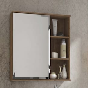 Espelheira para banheiro suspensa Treviso da MGM Móveis foi fabricada em MDF e possui uma porta com espelho e abertura de porta com fecho toque. Compõe também três prateleiras em MDF design moderno e amplo espaço.